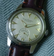 This stainless steel, beefy lugged sixties vintage automatic Girard-Perregaux has a mint condition, professionally refinished, dial with luminous hour markers and hands. This old vintage timepiece has been serviced by our watchmaker and is in excellent working condition. Photos are not actual size of watch, it measures 35 mm across (not including crown) x 43 mm lug to lug. Watch is fit with a new leather bracelet.