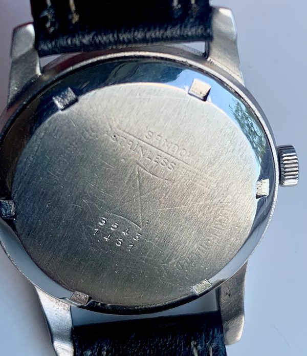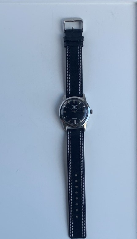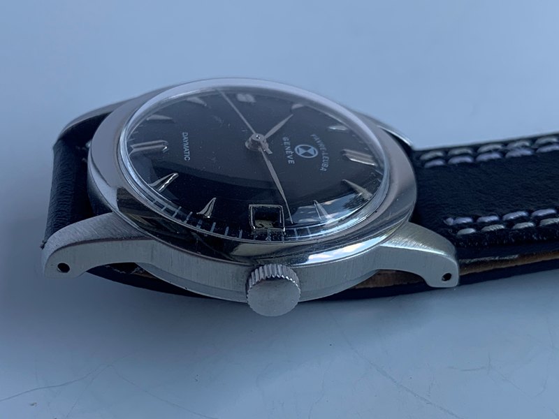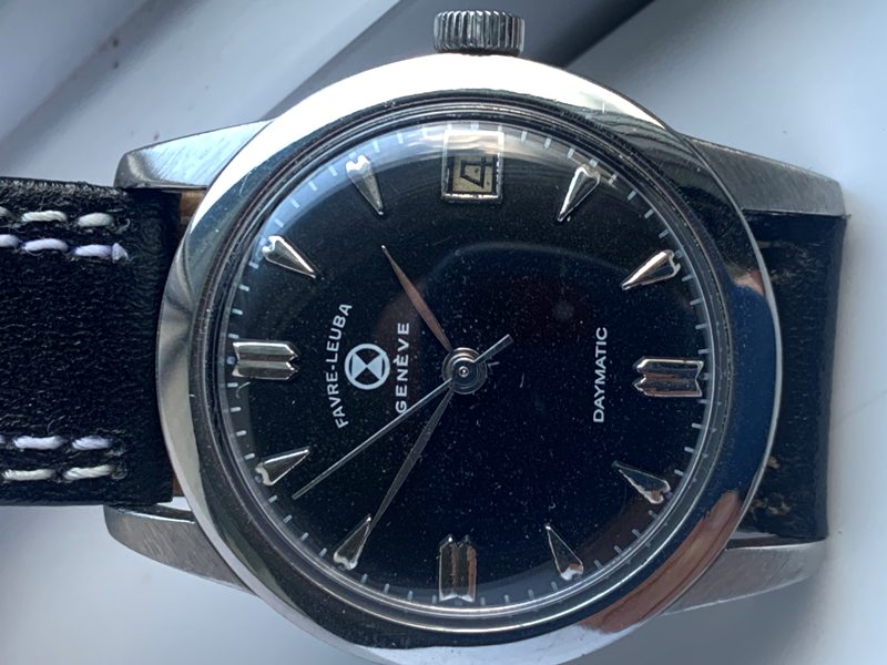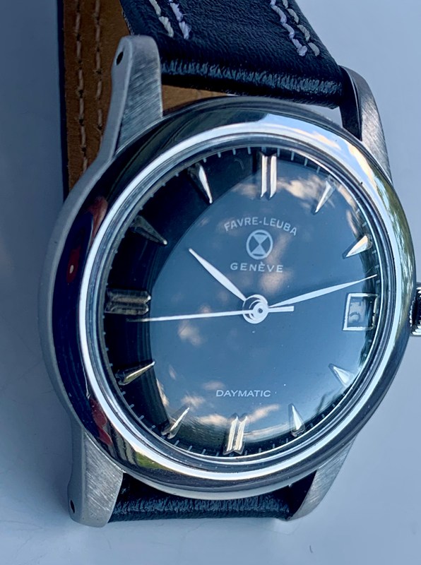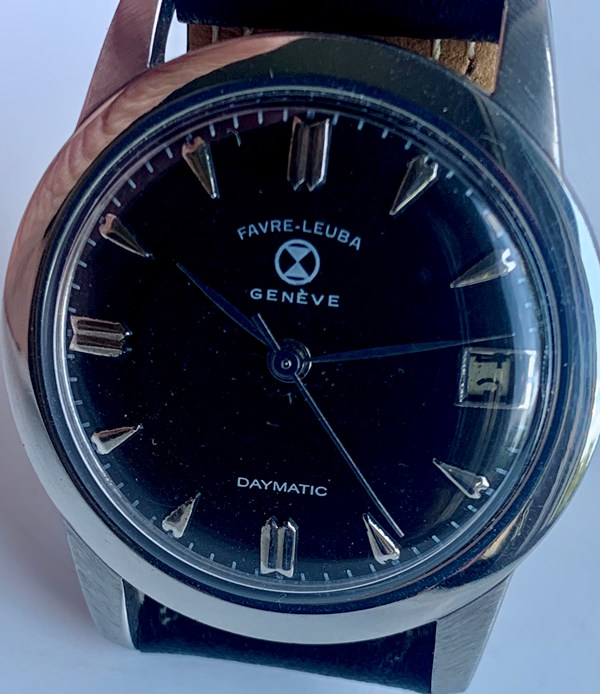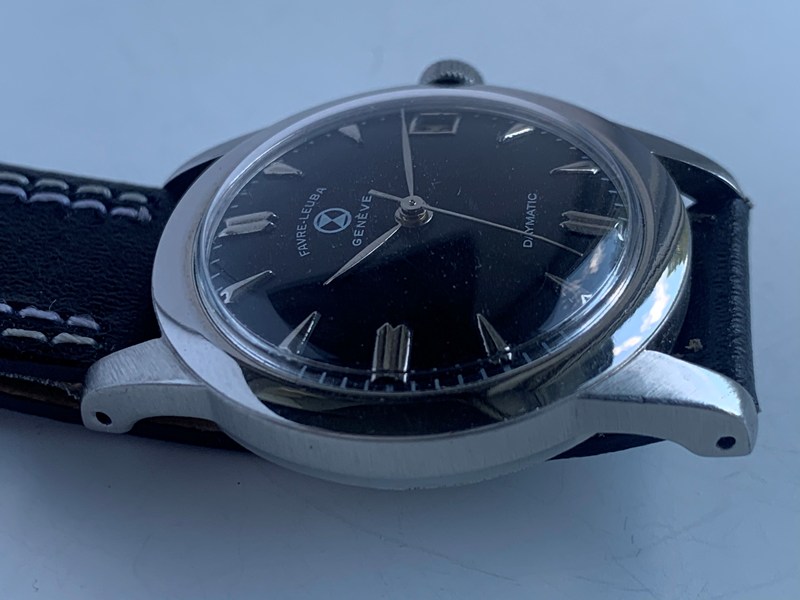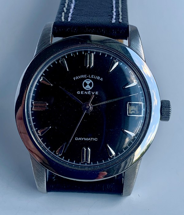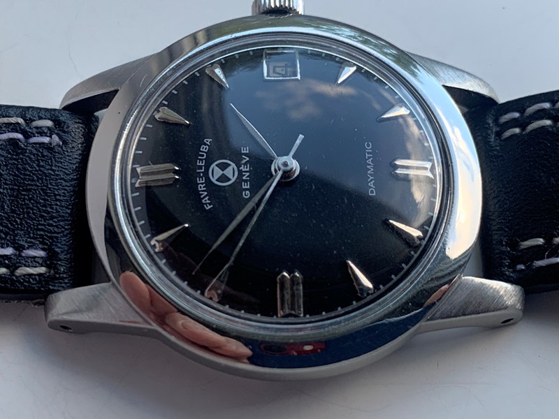 This beefy lugg stainless steel Favre-Leuba Daymatic has a great looking black dial that appears to have been professionally refinished in recent years. The case is marked Sandow on the back and has case references 3543 and 1431 inscribed, other lettering has been partially or completely erased due to repeated polishing. The watch dates to the 1960’s and is powered by an ETA cal 1258 automatic movement which is in good working condition has been serviced by our watchmaker. Photos are not actual size of watch, the case measures 34 mm across (not including crown) x 42 mm lug to lug and is fit with a leather bracelet.