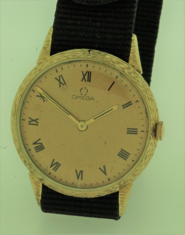 Omega 14K solid gold manual winder with bark finish case circa 1954 with original dial and Omega cal 511 movement which has been serviced and is in excellent working condition. Photos are not actual size of watch, the case measures 34 mm across (not including crown) x 42 mm lug to lug and is fit with a new Nato bracelet.
