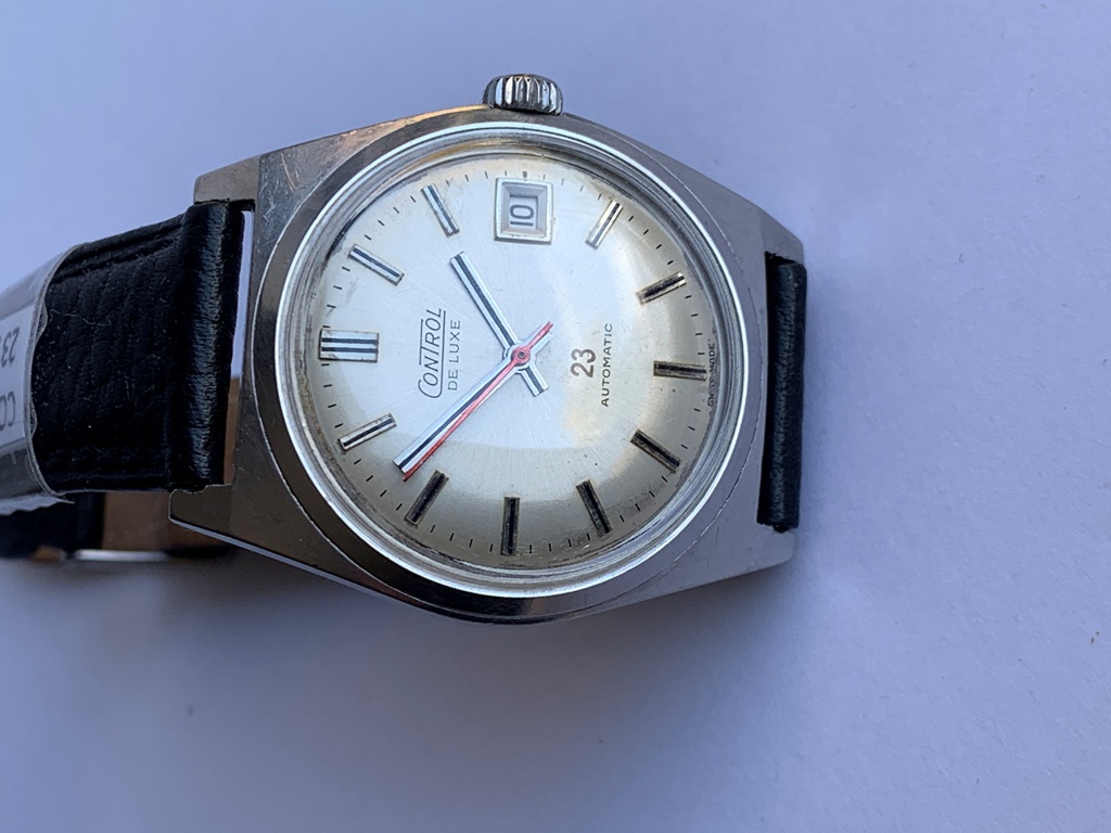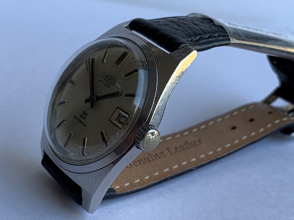 Good quality Swiss made Control De Luxe Automatic with date, it has a great looking original dial and is in a stainless steel case. The ETA cal 2472 movement is in excellent working condition and was serviced in Febuary/22. Photos are magnified and show details not seen by naked eye, the case measures 35 mm across (not including crown) x 44 mm lug to lug and is fit with a leather bracelet.