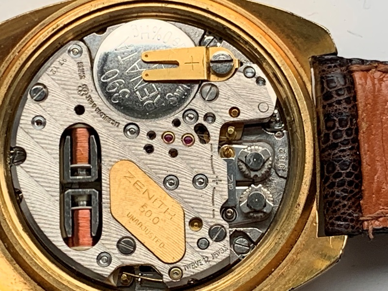 Zenith XL-Tronic electronic wristwatch circa mid 1970’s in gold plated case with stainless back. The Zenith 50.0 movement was licensed by Bulova and patented by ESA. observe movement. Photos are magnified and show details not seen by naked eye, the case measures 36 mm across (not including crown) x 40 mm lug to lug.