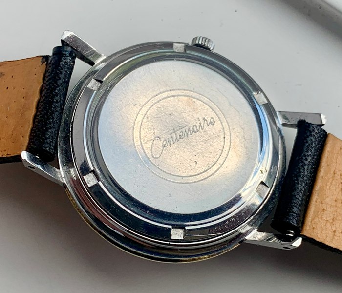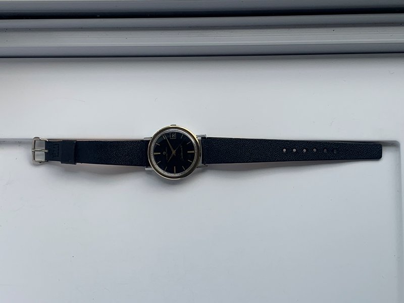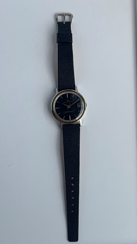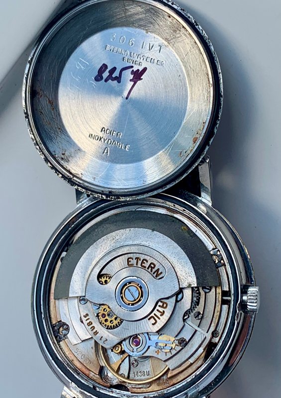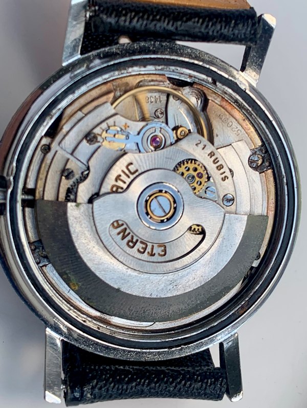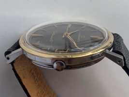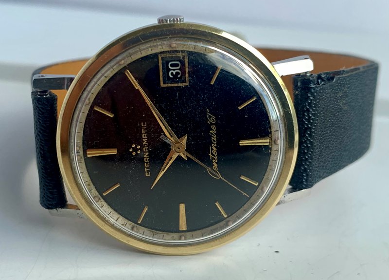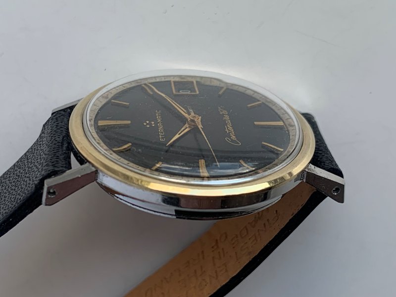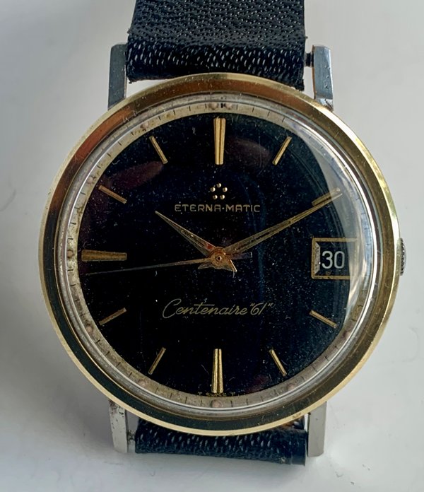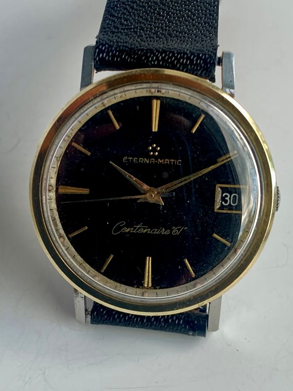 Great looking Eterna-Matic Centenaire 61 automatic with date, freshly serviced and keeping precise time on the wrist. Watch has a 1438u 21 jewel Eterna-matic movement with serial number that dates the watch to 1965. It has a black dial and gold tone sword hands and attached dial figures. The two tone steel case has a gold bezel. Photos are magnified and show details not seen by naked eye, the case measures 35 mm across (not including crown) x 41 mm lug to lug and comes on a leather strap.