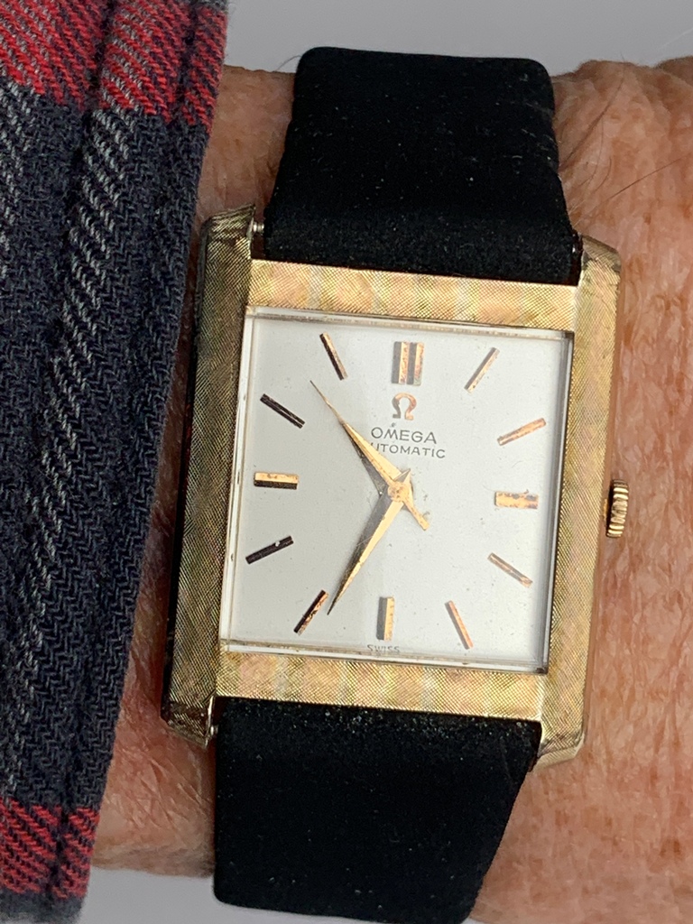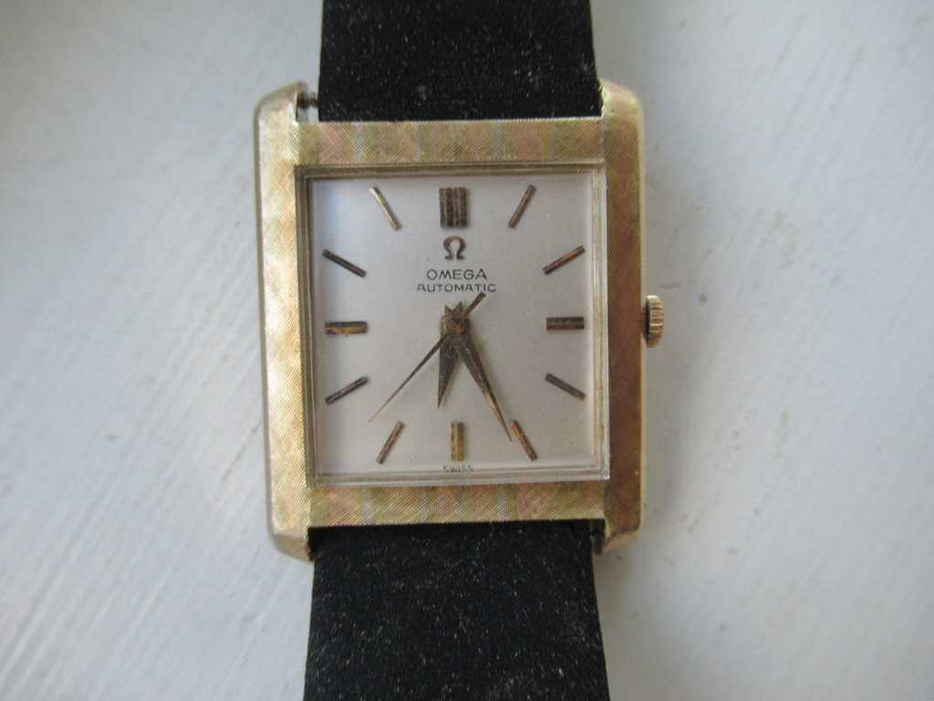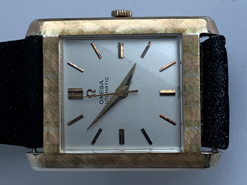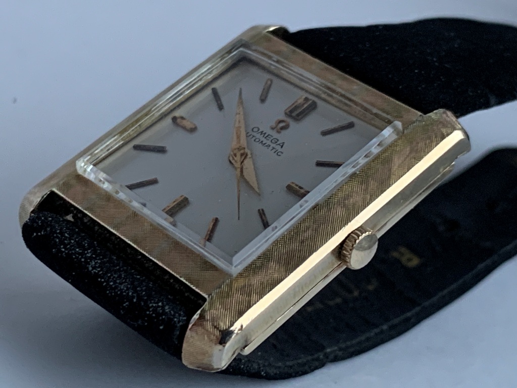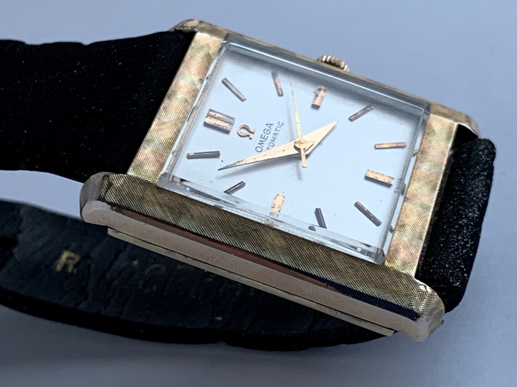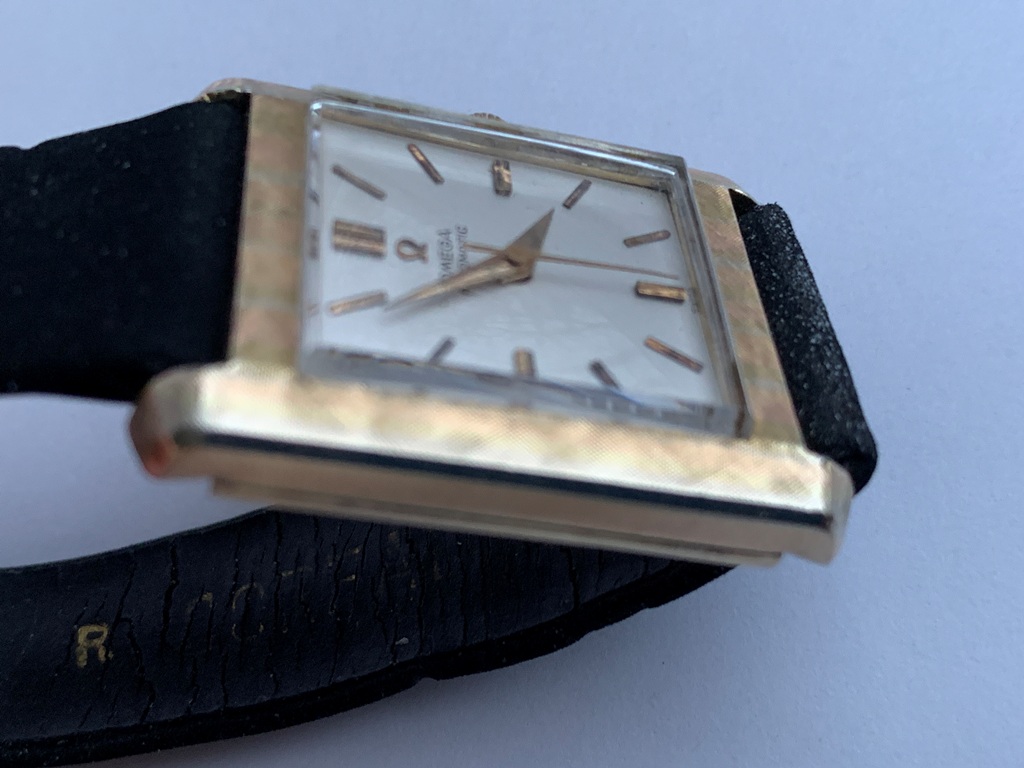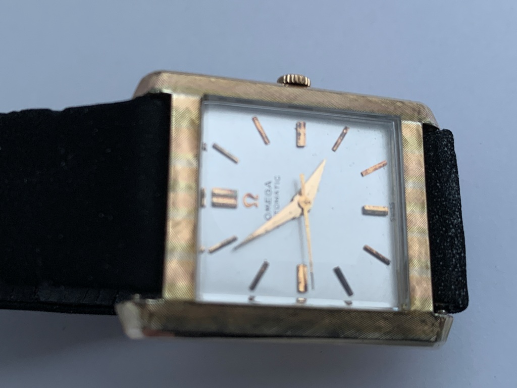 Great looking automatic Omega Tank men’s dress watch, ref L5297, (sometimes called the Cartier Tank Francaise Of Omega) in 14K Gold Filled case. This watch dates from late 1959 and also somewhat resembles the famous Omega Tank watch gifted to JFK that he was seen wearing in the early 1960s. The silvered dial on this watch is original amd great condition and the case has a linen textured finish that really stands out. The case is great overall with only one small spot of wear on the back. The crystal is in mint condition. The case has a personal engraving on the back. It is powered by a pristine automatic Omega Cal 570 movement, which runs accurately on the wrist. It winds both manually and under the power of the automatic rotor. It comes on a black strap. Photos are magnified and show details not seen by naked eye, the case measures 28.5 mm across (not including crown) x 35 mm lug to lug, which was considered full size for an Omega Tank back in the day.