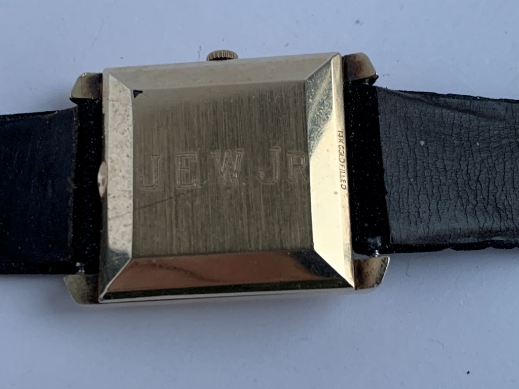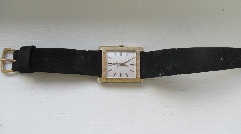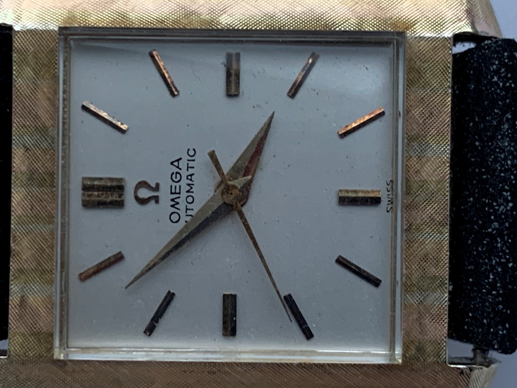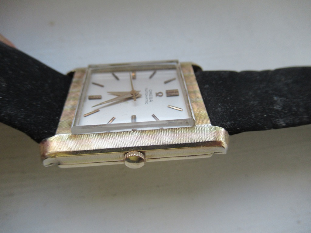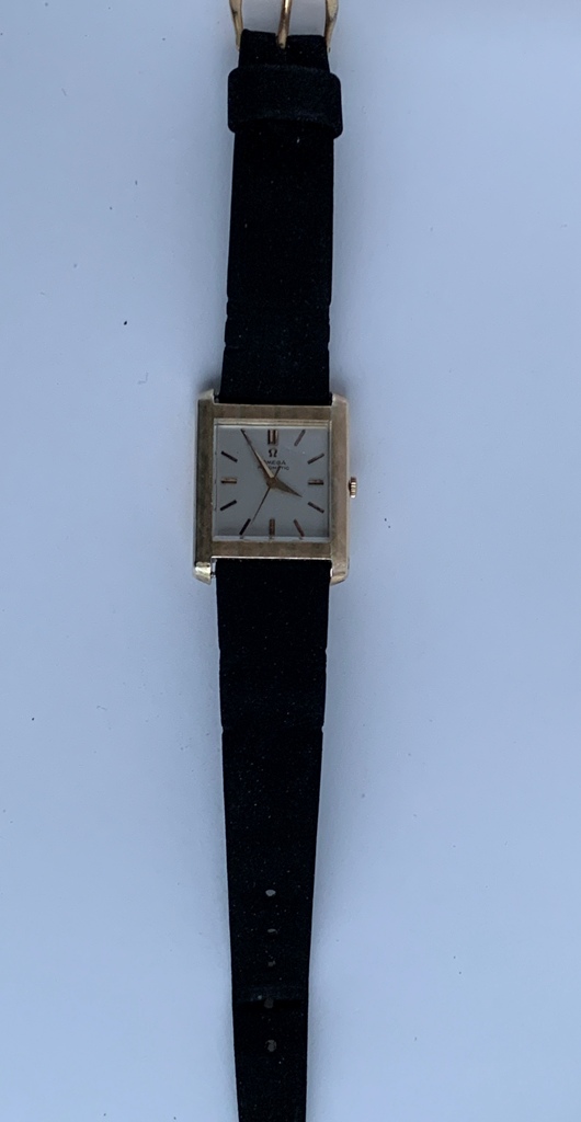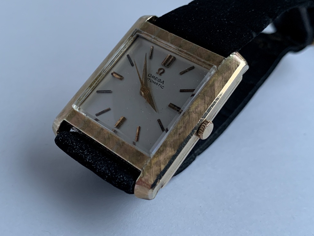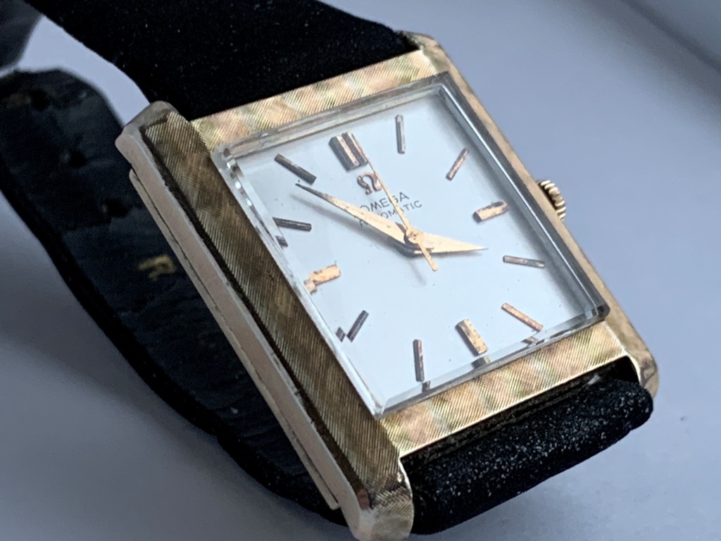 Great looking automatic Omega Tank men’s dress watch, ref L5297, (sometimes called the Cartier Tank Francaise Of Omega) in 14K Gold Filled case. This watch dates from late 1959 and also somewhat resembles the famous Omega Tank watch gifted to JFK that he was seen wearing in the early 1960s. The silvered dial on this watch is original amd great condition and the case has a linen textured finish that really stands out. The case is great overall with only one small spot of wear on the back. The crystal is in mint condition. The case has a personal engraving on the back. It is powered by a pristine automatic Omega Cal 570 movement, which runs accurately on the wrist. It winds both manually and under the power of the automatic rotor. It comes on a black strap. Photos are magnified and show details not seen by naked eye, the case measures 28.5 mm across (not including crown) x 35 mm lug to lug, which was considered full size for an Omega Tank back in the day.