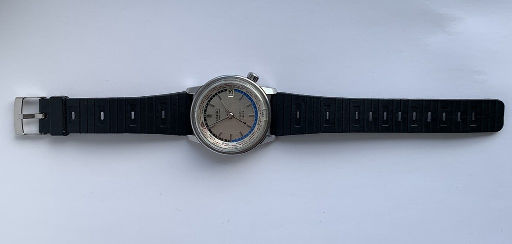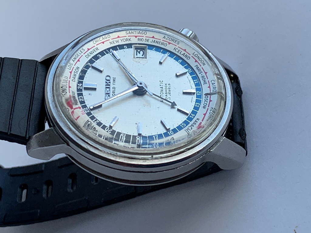 The steel case is in overall good condition, the large Seiko crown is the correct one for this model, but the case back is not original. The original crystal is fairly good, legibility is clear but it does have 2 small cracks at the 6. and a small scuff at the edge. The watch has its original silvered linen dial which is in nice overall condition, as are the hands. The inner turning world cities bezel is in pristine shape with one small stain. Photos are magnified and show details not seen by naked eye, the case measures 38 mm across (not including crown) x 43 mm lug to lug. It comes as found on a rubber strap as pictured.