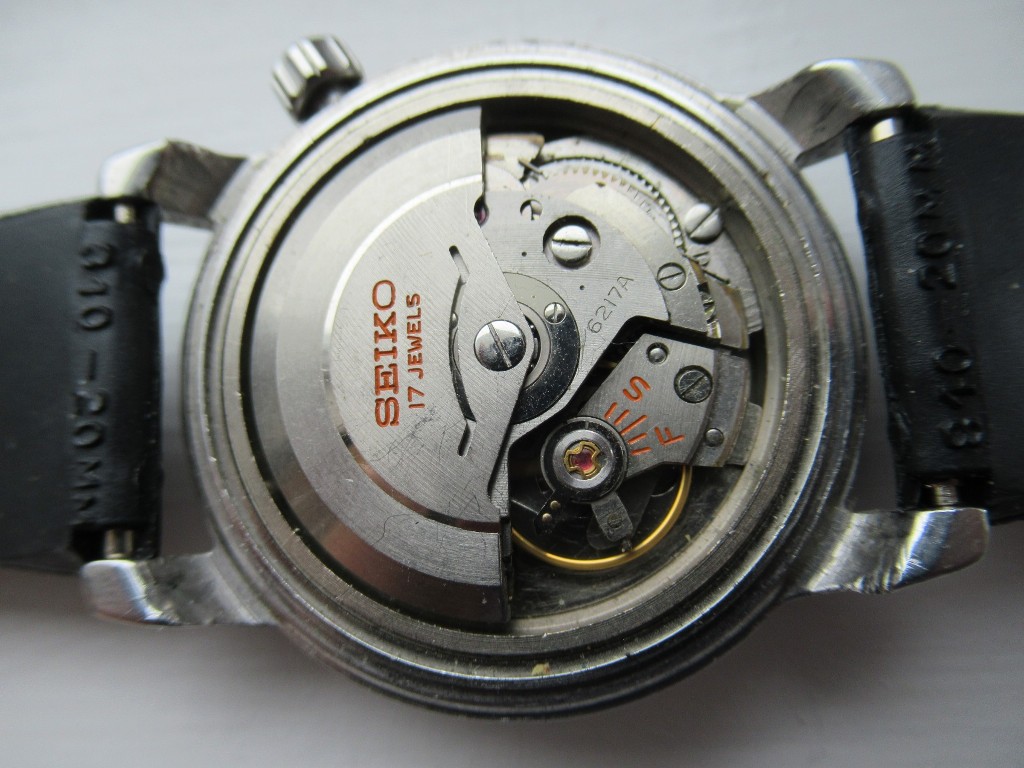 Rare and collectible vintage Seiko GMT World Time automatic watch from 1964. Please note: case back is not original. The model number is 6217 7000. This watch is from a series made specifically for the 1964 Tokyo Olympics. The Seiko 6217A movement powering this watch is in full working order and keeps accurate time on the wrist. The 24 hour hand accurately shows the elapsed time on the inner ring. The quickset date changes from crown position 2; the inner bezel turns freely from crown position 1. Time setting is from position 3. (This model does not have manual winding; it winds and starts up with a few shakes to the rotor.)