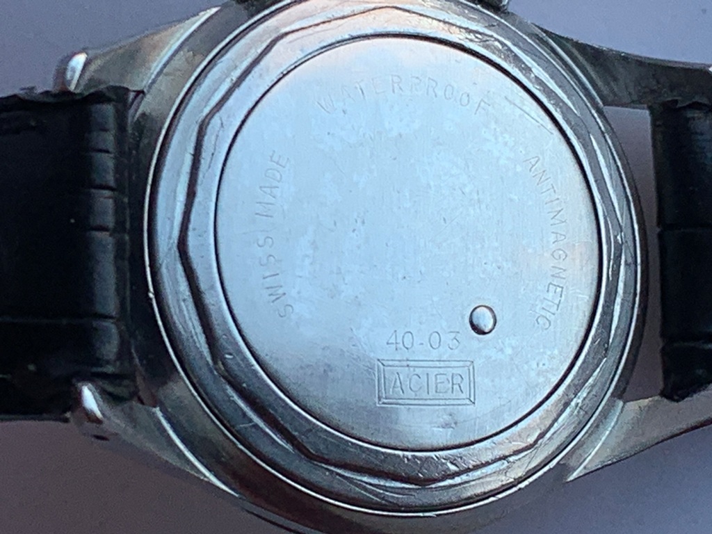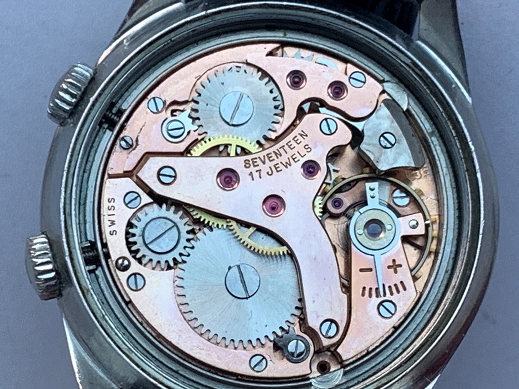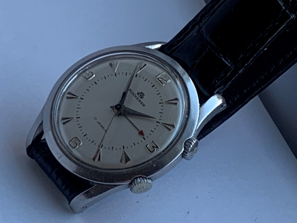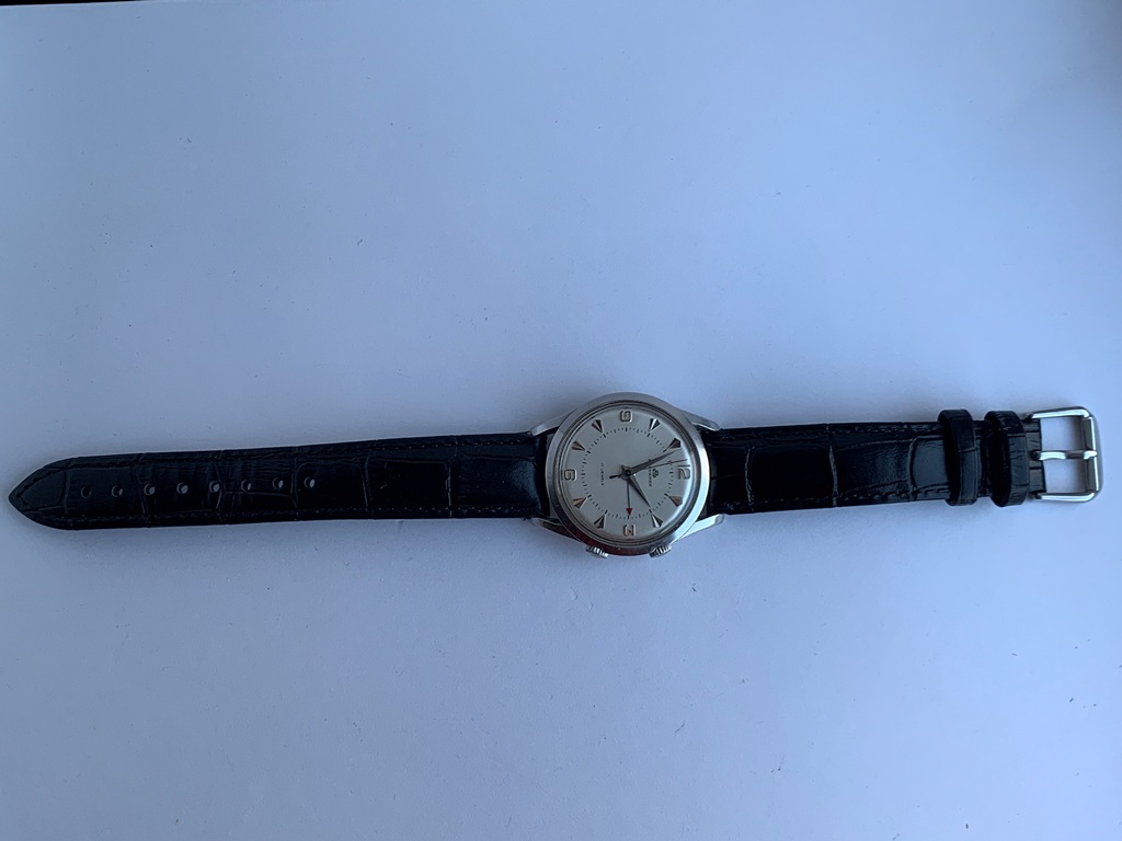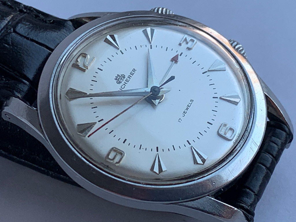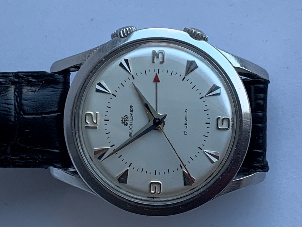 Great looking wrist alarm from high end Swiss Jeweller Bucherer, dating to circa 1960. The alarm winds and sets with upper crown, watch works very well and keeps precise time. Previous owner said watch had been serviced but service date is unknown. The stainless steel case is in very good condition with only minor signs of wear and the dial is very clean and appears to have been refinished some time ago. Watch is powered by an AS1475 movement (the work horse of many vintage alarms), the alarm rings out loud and the watch keeps precise time. The watch measures 34.5 mm wide excluding the crowns x 41 mm lug to lug and is 10.35 mm thick. It is fit with a black leather strap with 18 mm lug width. Photos are magnified and show details not seen by naked eye.