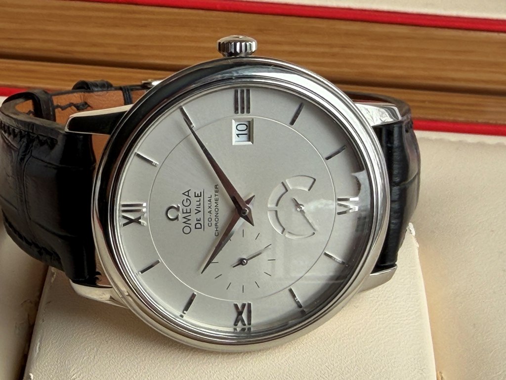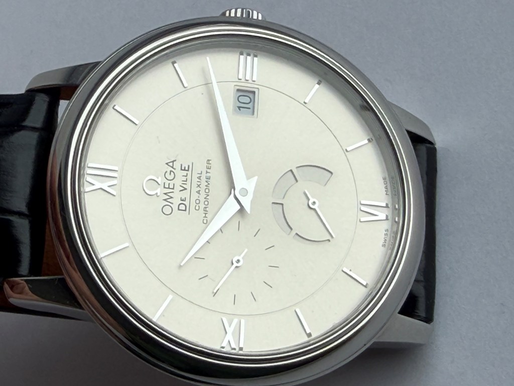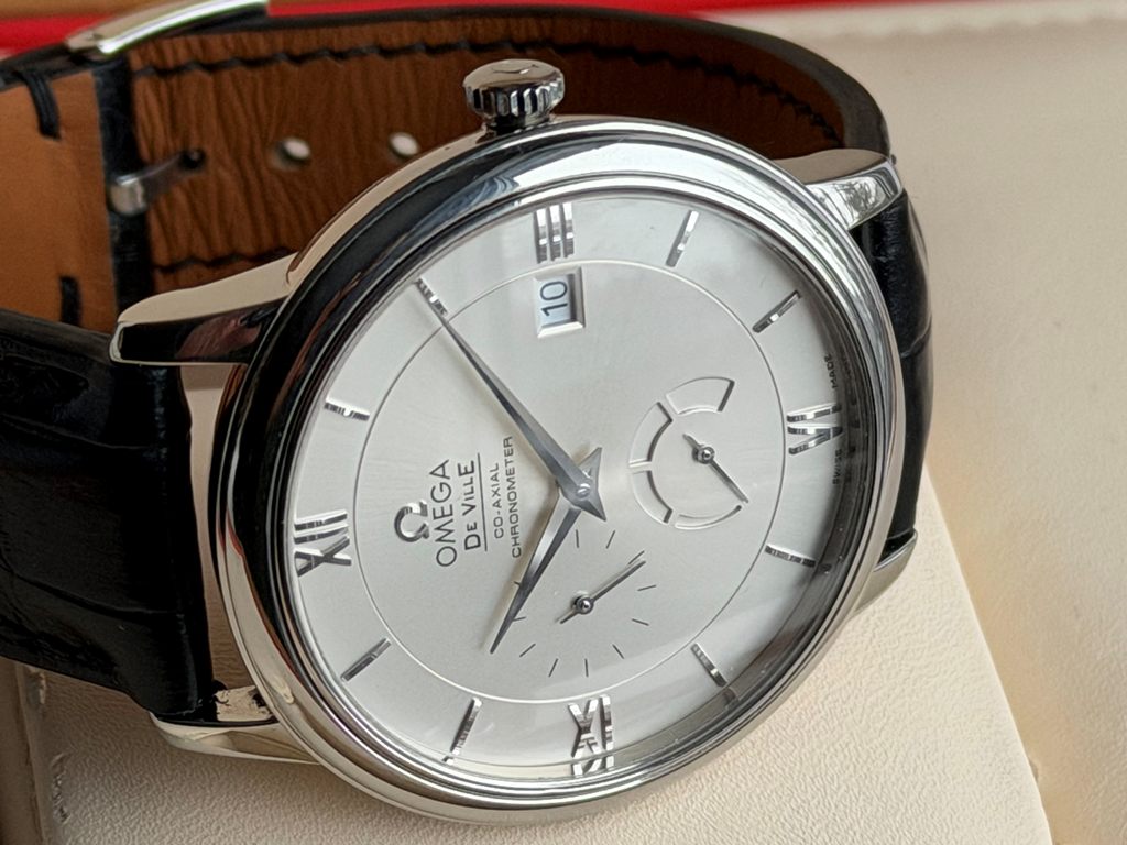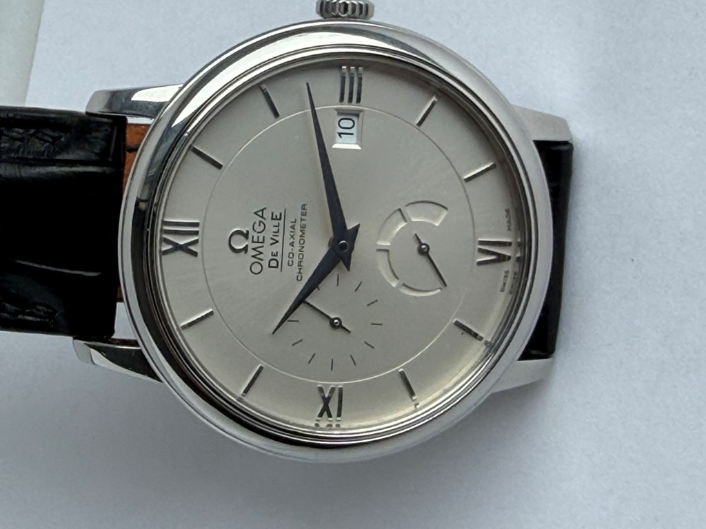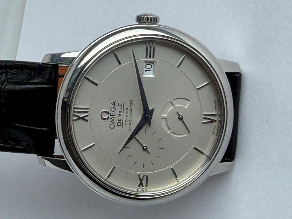Pre owned, very lightly used, almost new condition Omega Deville Prestige wristwatch with CO-Axial 29 jewel automatic movement in stainless steel case. The silver dial has raised Roman Numerals and markers and has a power reserve indicator. Watch comes in original wooden box and has warranty cards and instructions booklet. This Omega is from 2017.
