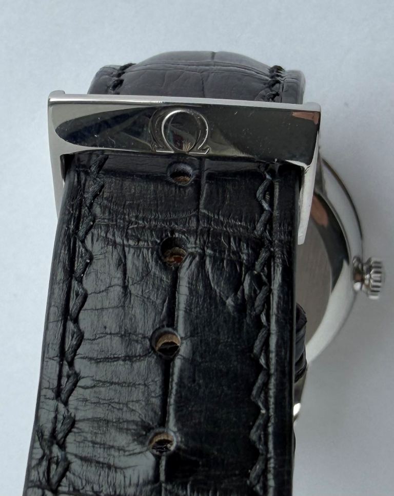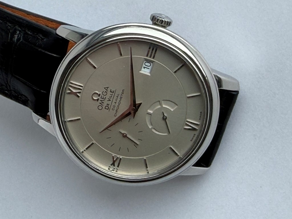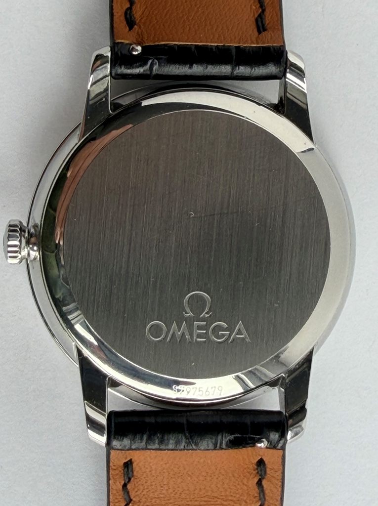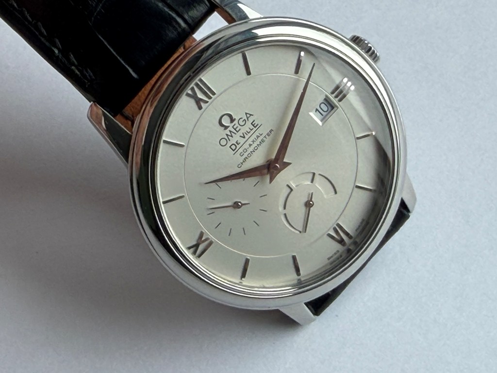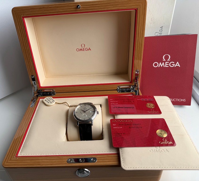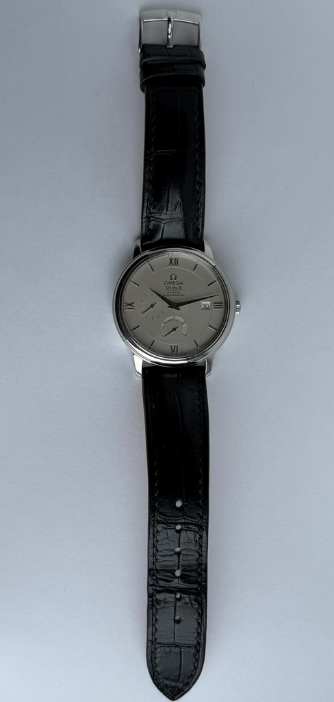 Pre owned, very lightly used, almost new condition Omega Deville Prestige wristwatch with CO-Axial 29 jewel automatic movement in stainless steel case. The silver dial has raised Roman Numerals and markers and has a power reserve indicator. Watch comes in original wooden box and has warranty cards and instructions booklet. This Omega is from 2017.