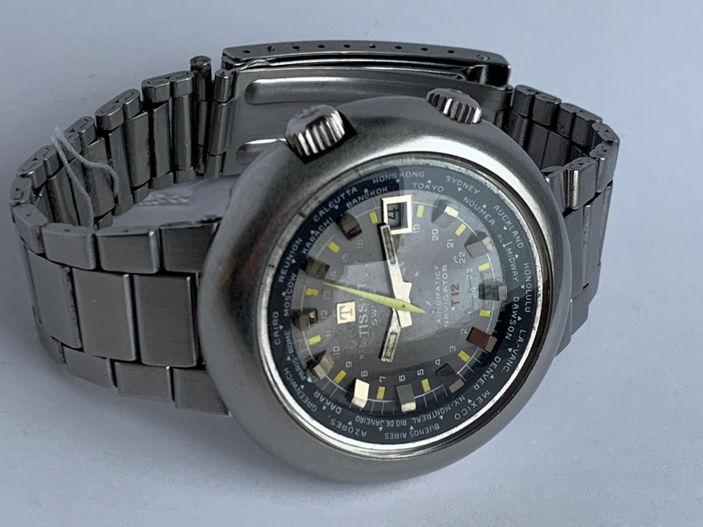 Tissot Super Navigator T12 World Time Compressor with 24 hour dial circa 1969 in stainless steel case and with original Tissot steel bracelet. Watch is in very good condition, has original dial with minor paint loss and two signed crowns. The Tissot 21 jewel Lemania Cal 788 automatic movement works well and keeps accurate time. Tissot made the Super Navigator T-12 with several different dials and internal bezels, the world time dial is probably the most sought after and collectable. The Super T-12 Navigator Worldtime Ref 44596 was described in the 1969 owner’s manual as “a large sized diver’s watch, super-tight (Water resistance guaranteed up to 200 meters deep). This watch has 24 hours time dial, not 12, the hour hand rotates the dial every 24 hours, corresponding to the earth rotating the sun (or earth around it’s axis), the standard time is thus read from 1 to 24 hours.”